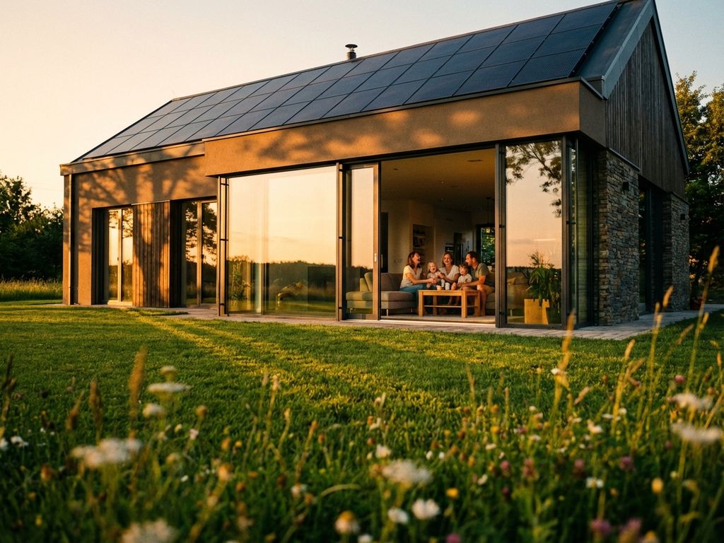 Modernes umweltfreundliches Haus mit Solarpanels und großen Fenstern, Familie im Inneren sichtbar, umgeben von Bäumen