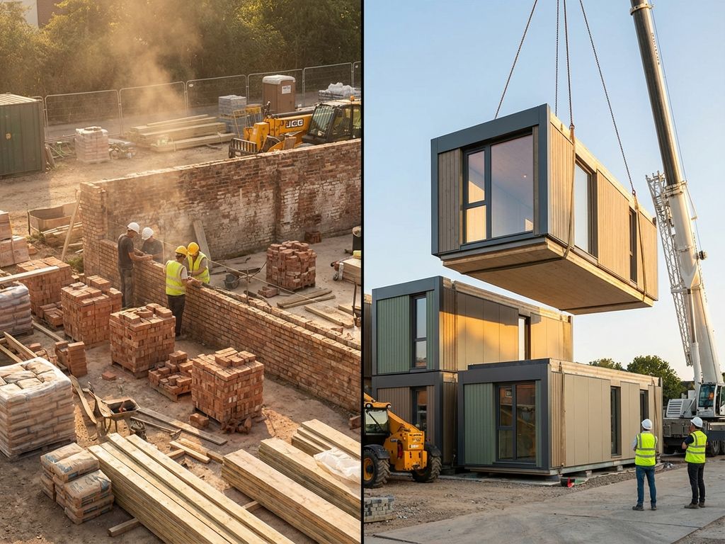 Modulbau-Vergleich: traditioneller Ziegelbau links, effiziente vorgefertigte Module rechts mit Kran und nachhaltigen Materialien