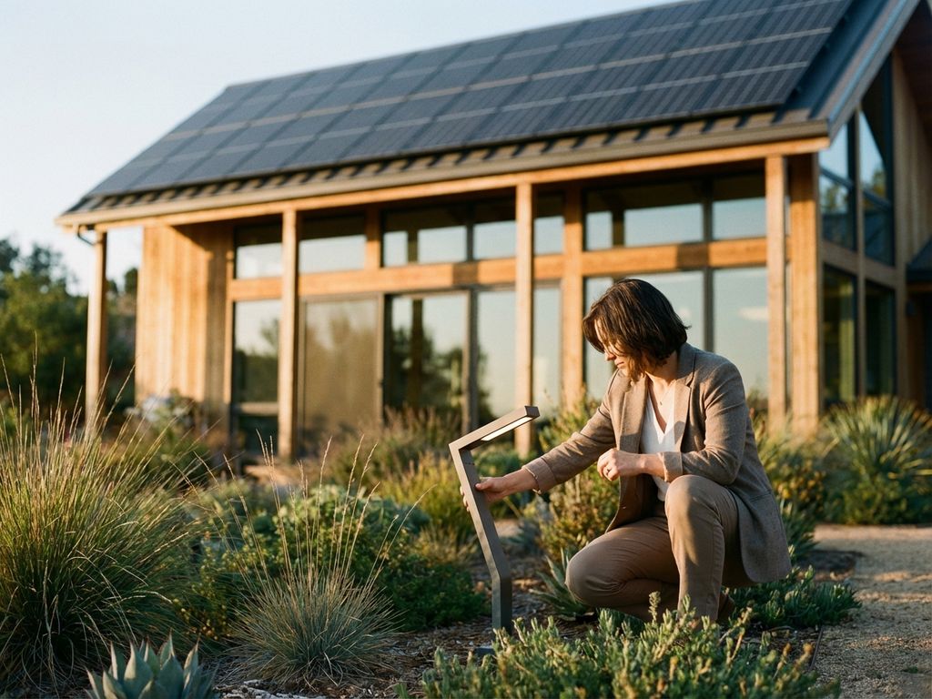 Person in Anzug prüft LED-Beleuchtung vor nachhaltigem Haus mit Solarpanels und dreifach verglasten Fenstern